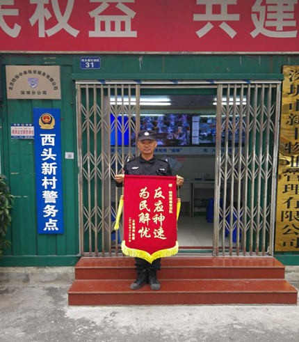 我司鐵保宏泰保安班長張峰在西頭小區正常巡邏時,發現有異常外來人員在電動車停車場閑逛,班長張峰立即前往詢問和檢查,發現一輛電動車已經被撬開,班長立即對可疑人員立即抓捕,因小區處于開放式管理嫌疑人已經逃竄。車輛主人得知情況對班長這種認真負責的態度給予了高度認可和好評,并且贈送為民解憂 反應神速錦旗。