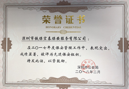 祝賀我司在2017年度保安管理工作中,表現突出,成績顯著,被深圳市公安局評為先進保安組織。