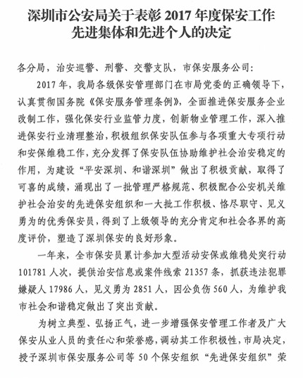 深圳市公安局關于表彰2017年度保安工作,先進集休和先進個人的決定