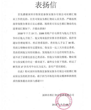 首先感謝深圳市鐵保宏泰保安服務有限公司對都匯物業工作的支持,在貴司保安為都匯物業認真負責,嚴格按照規章制度辦事表示衷心感謝,現將貴司保安在都匯物業的先進事跡匯報如下,并提出表揚!